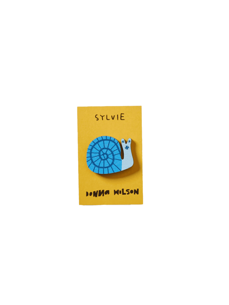 A printed wooden pin badge by Donna Wilson in the shape of our feistiest creature, Sylvie Snail.